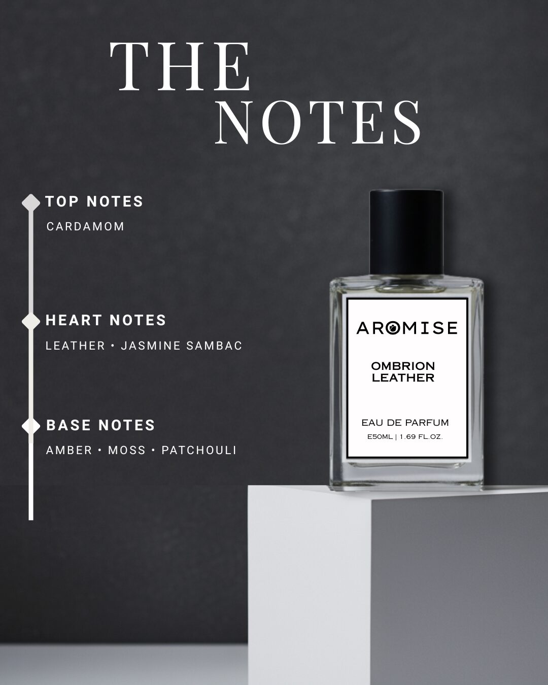 The fragrance opens with the rich intensity of smooth black leather, instantly commanding yet impeccably polished. This bold opening is softened by the subtle floral touch of Jasmine Sambac, lending a refined contrast that balances strength with sensuality.