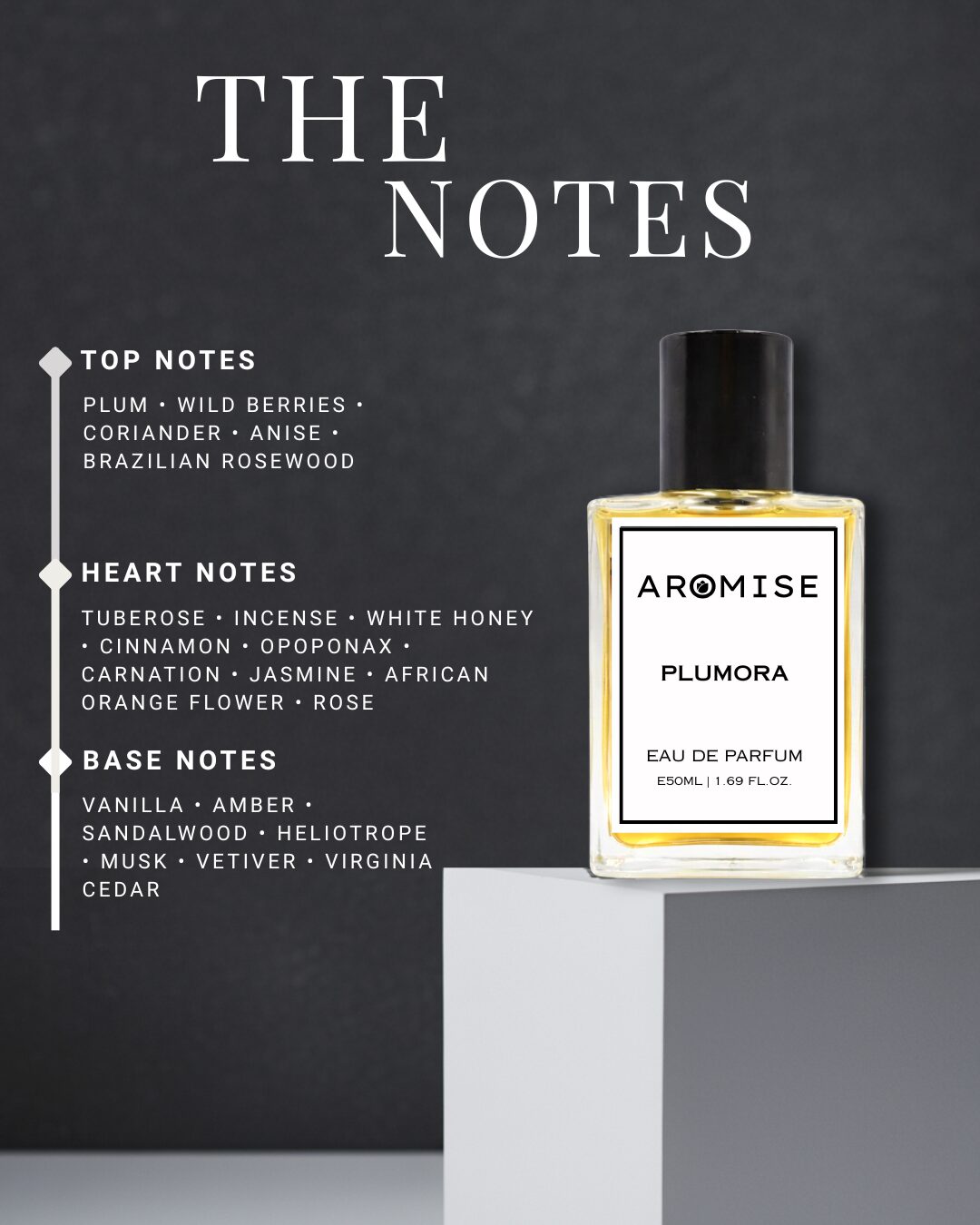 At Aromise, we were inspired by Poison’s fearless spirit and iconic intensity, and reimagined it through a modern, refined lens. Plumora is our tribute to that timeless classic — a fragrance for those who embrace their presence, command attention, and leave a lasting impression.